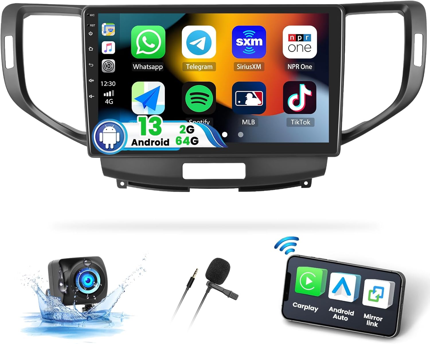 Figure 1.1: UNITOPSCI Android Car Stereo Radio with its main display and included components like the backup camera and microphone.