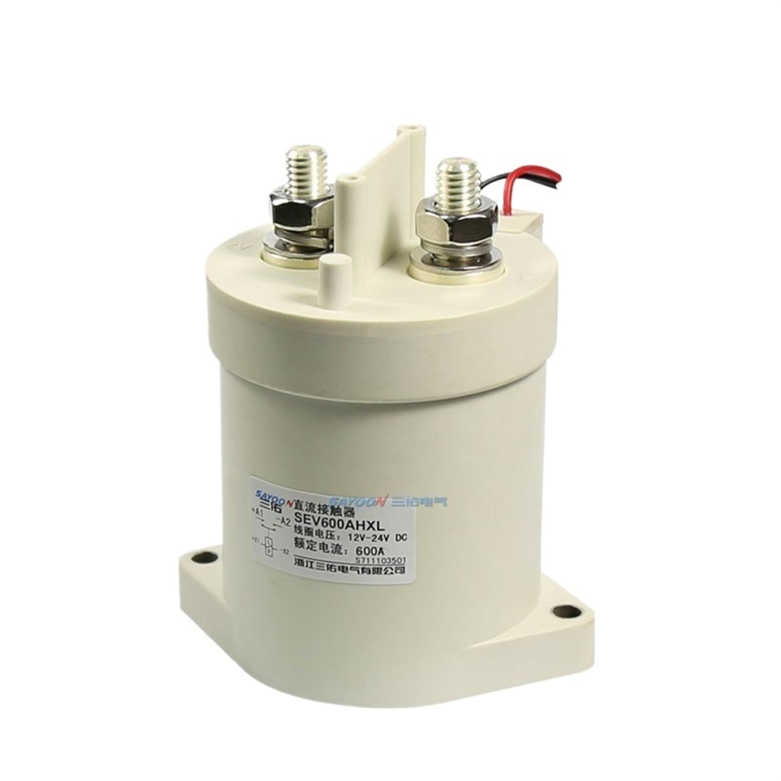 Image showing a UOFKIPBA high voltage DC contactor. This representative image displays two main terminals with nuts and washers for power connections, and a label indicating 'SAYOON', 'SEV600AHXL', 'Coil Voltage: 12V-24V DC', and 'Rated Current: 600A'. The actual product is SEV3600ADXL with a 24V coil.