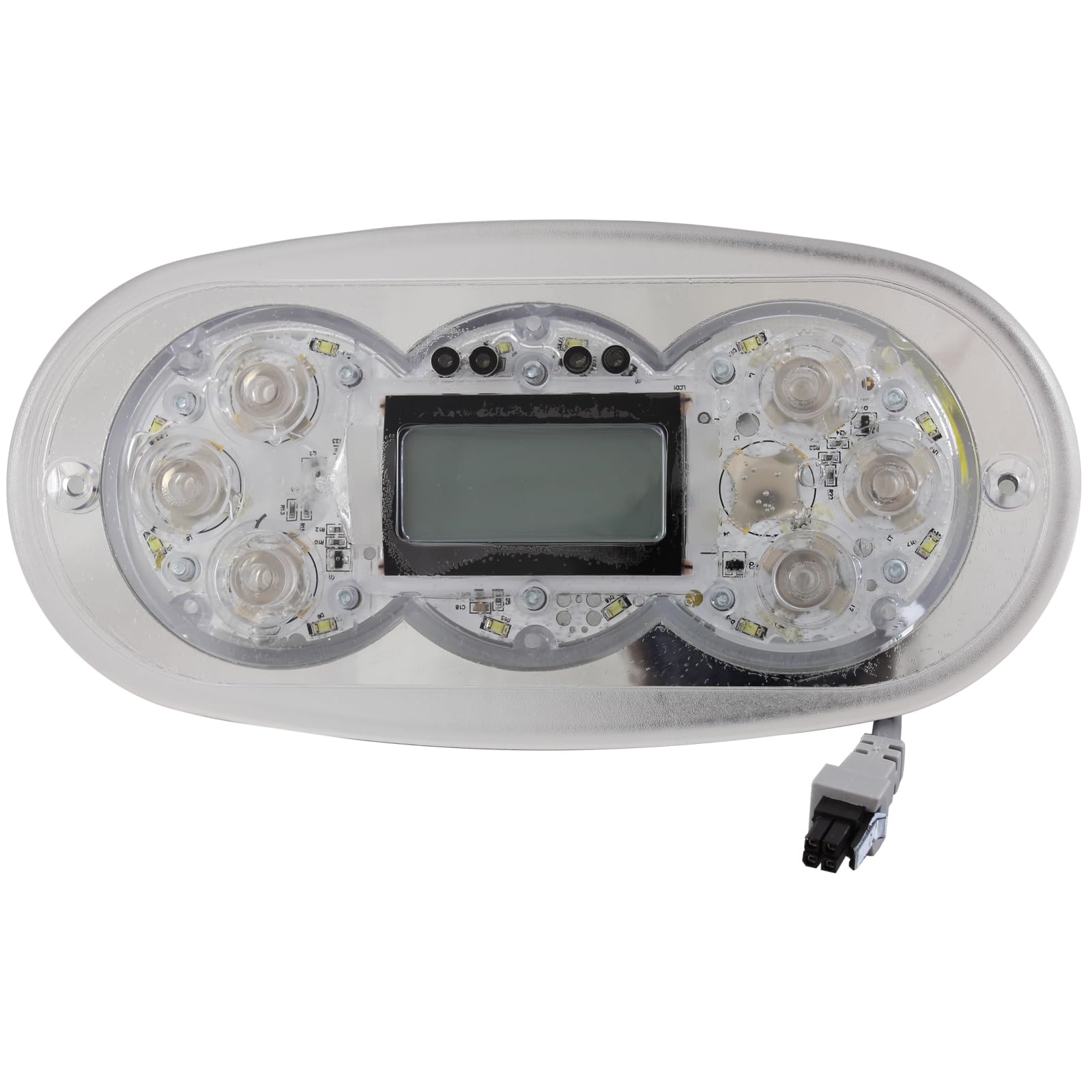 The Balboa Water Group G8460 TP600 is an oval-shaped, 6-button topside control panel. It features a clear display and intuitive button layout for managing various spa functions such as jets, lighting, temperature, and mode settings. The controller connects to the main spa pack via a 6-foot cable with a Molex 4-pin connector.