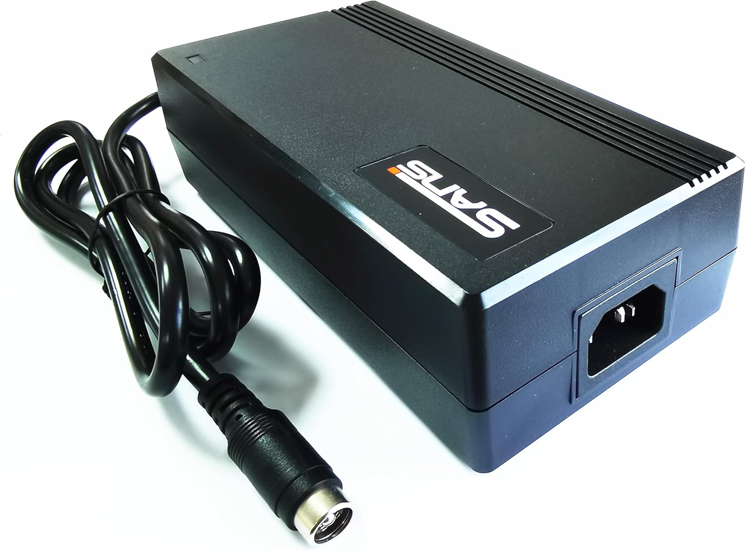 Image: The charger unit shown with its detachable AC power cable and DC output cable, featuring the Straight Lotus Jack Connector.