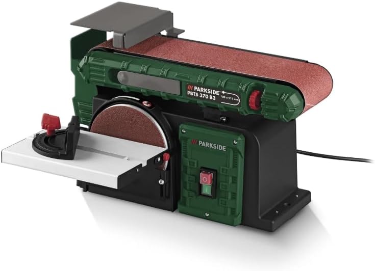 Figure 1: Overall view of the PARKSIDE PBTS 370 B3 Belt Sander, showcasing its compact design and main components including the belt and disc sanding areas.