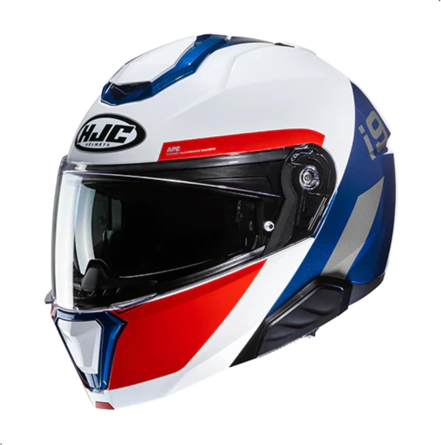 Image: Front-side view of the HJC i91 Modular Motorcycle Helmet in MC21 color scheme (white, blue, red accents).