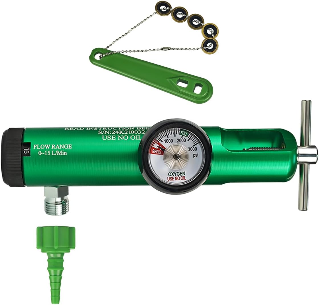 Image: The Oxygen Regulator, showing its main body, pressure gauge, flow selector, and included accessories: a wrench, brass yoke washer seals on a chain, and an oxygen tubing swivel nipple.
