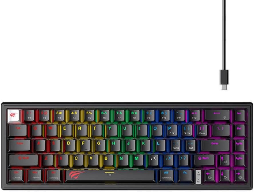 The Havit KB874L is a compact 67-key mechanical gaming keyboard designed for performance and durability. It features a QWERTY layout, customizable RGB backlighting, and a robust build quality.