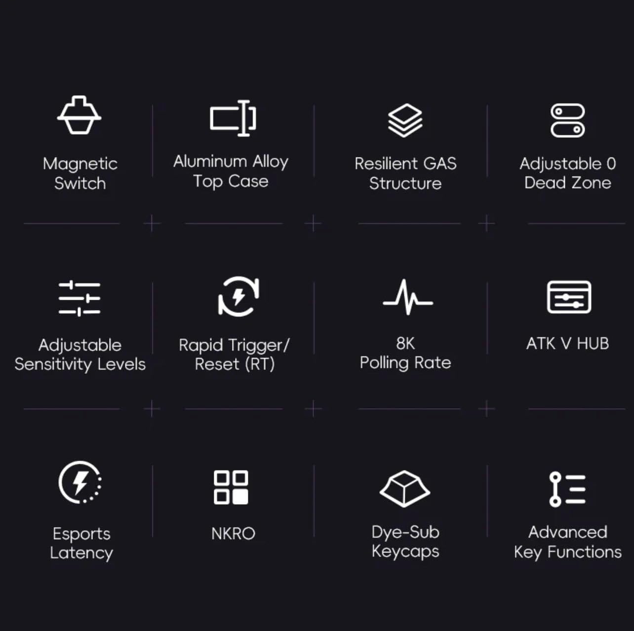 - Rapid Trigger/Reset (RT): Advanced feature for competitive play, allowing keys to re-actuate instantly upon reset.