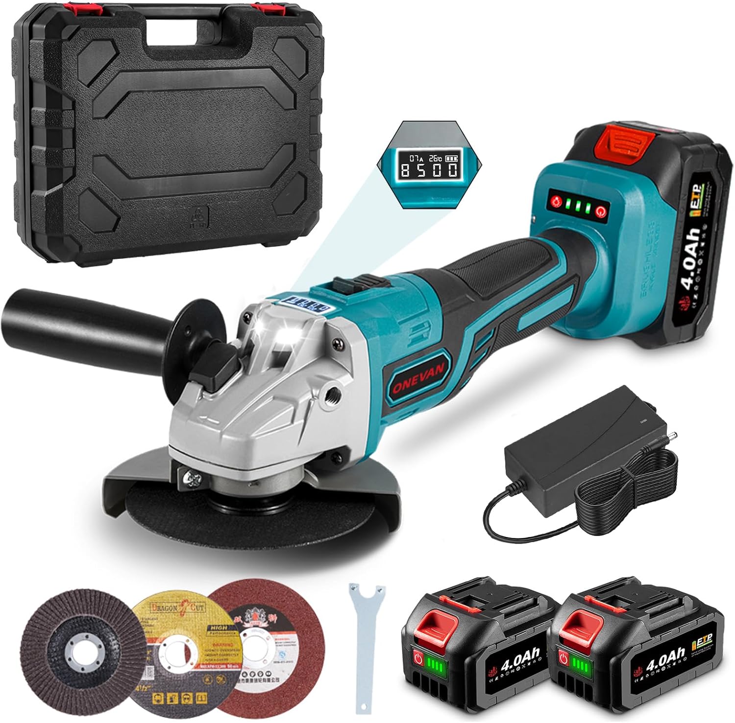 Image 1.1: ONEVAN Cordless Angle Grinder with two 4.0Ah batteries, charger, carrying case, and various grinding/cutting discs.