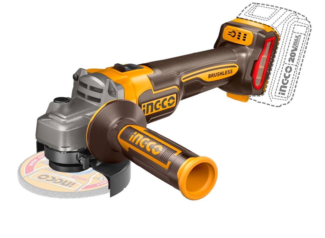 The Ingco CAGLI21154 Cordless Brushless Angle Grinder is designed for efficiency and durability. Key components include the main body with the brushless motor, the spindle for attaching grinding/cutting discs, the protective guard, and the auxiliary handle for improved control. The tool operates on a 20V battery system (sold separately).