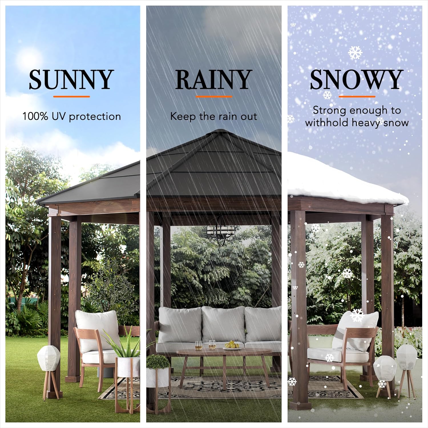 The gazebo is designed to withstand various weather conditions, offering UV protection, rain resistance, and snow load capacity.