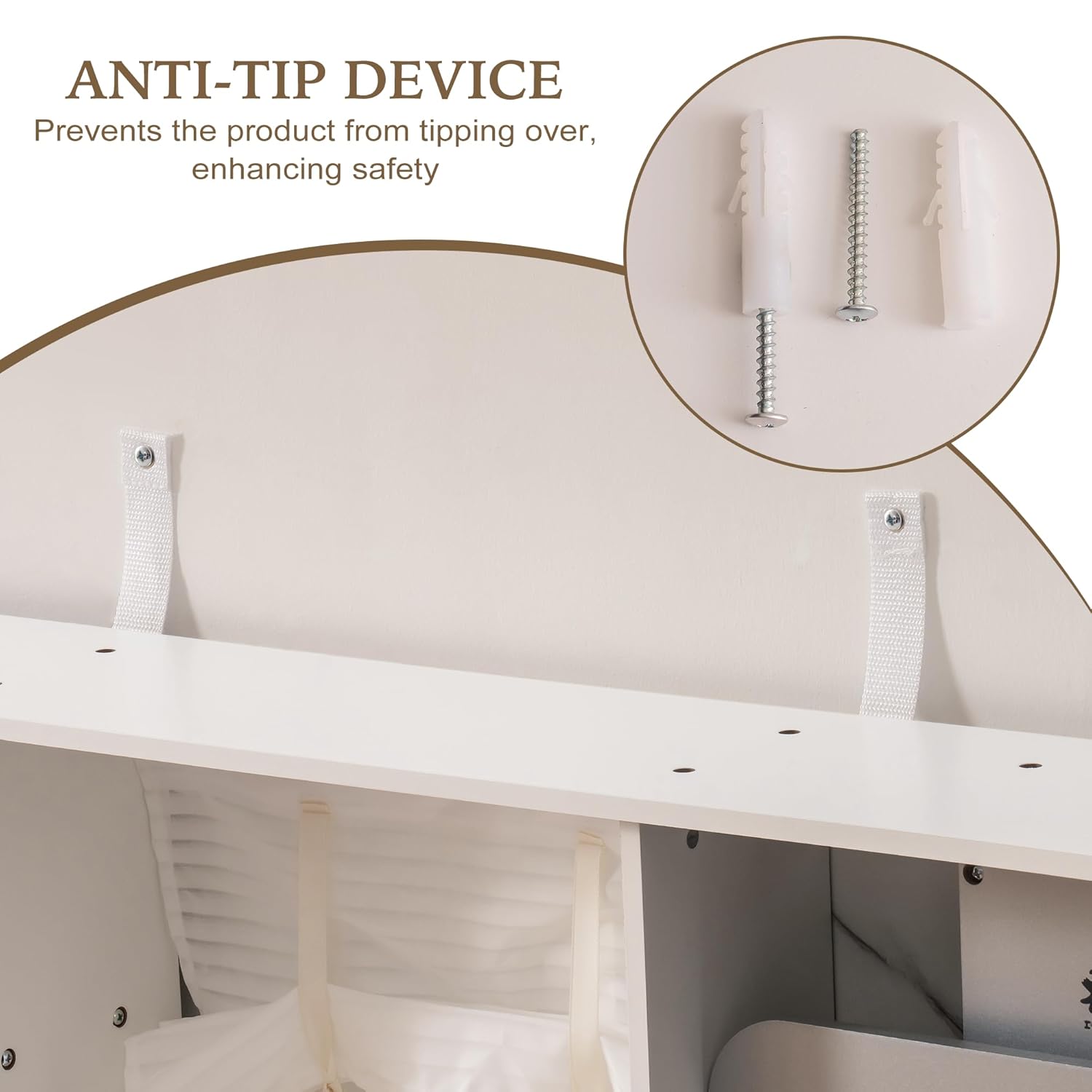Image: Close-up of the anti-tip device, showing screws and wall anchors for secure installation. This device helps prevent the play kitchen from tipping over.