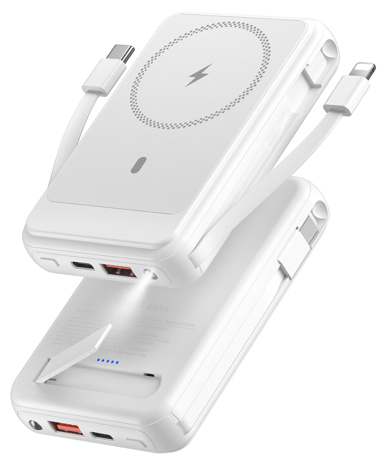 - Built-in Cables: Integrated Type-C and iOS (Lightning) cables for direct wired charging.