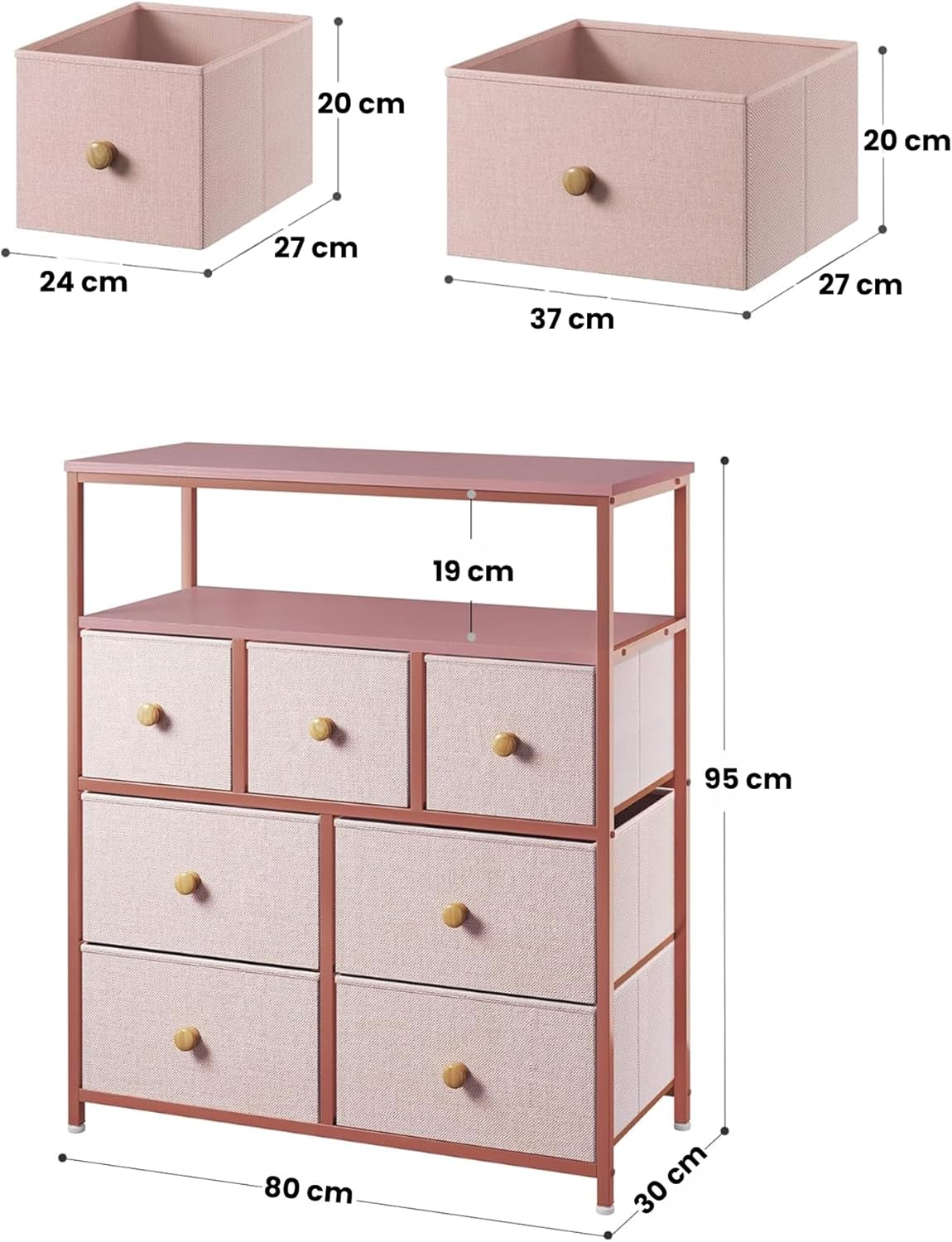Image: Overall dimensions of the dresser and individual drawer sizes. The dresser measures 80 cm (W) x 30 cm (D) x 95 cm (H). Small drawers are 24 cm (W) x 27 cm (D) x 20 cm (H). Large drawers are 37 cm (W) x 27 cm (D) x 20 cm (H).