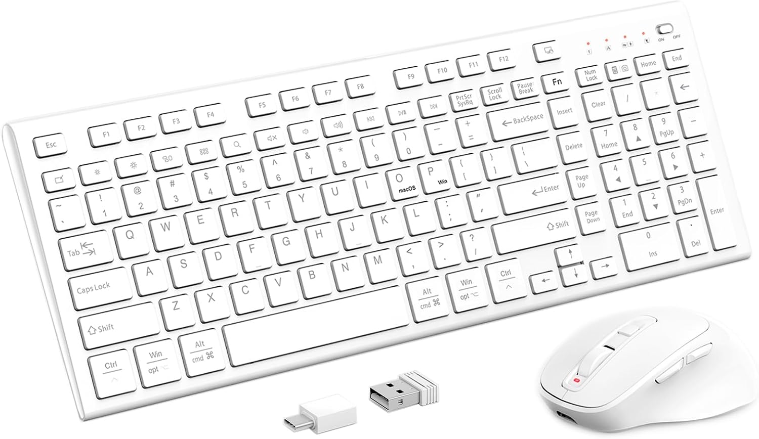 The keyboard and mouse connect wirelessly via a single USB receiver.