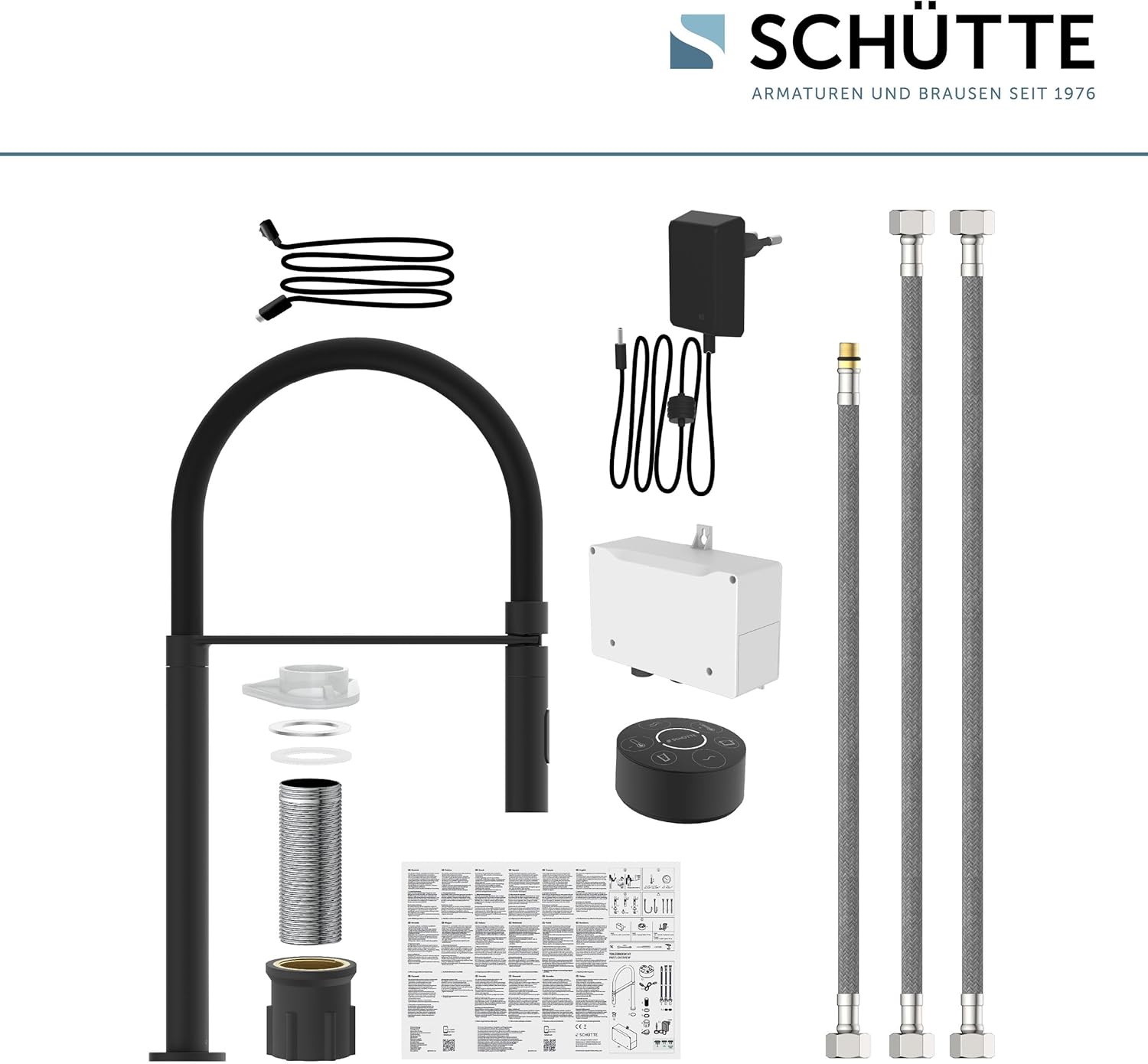 Image Description: An overhead view of all components included in the Schütte Aquadot faucet package. This includes the main faucet body, the separate digital control unit (DOT), mounting hardware, hot and cold water supply hoses, a power adapter, and the instruction manual.