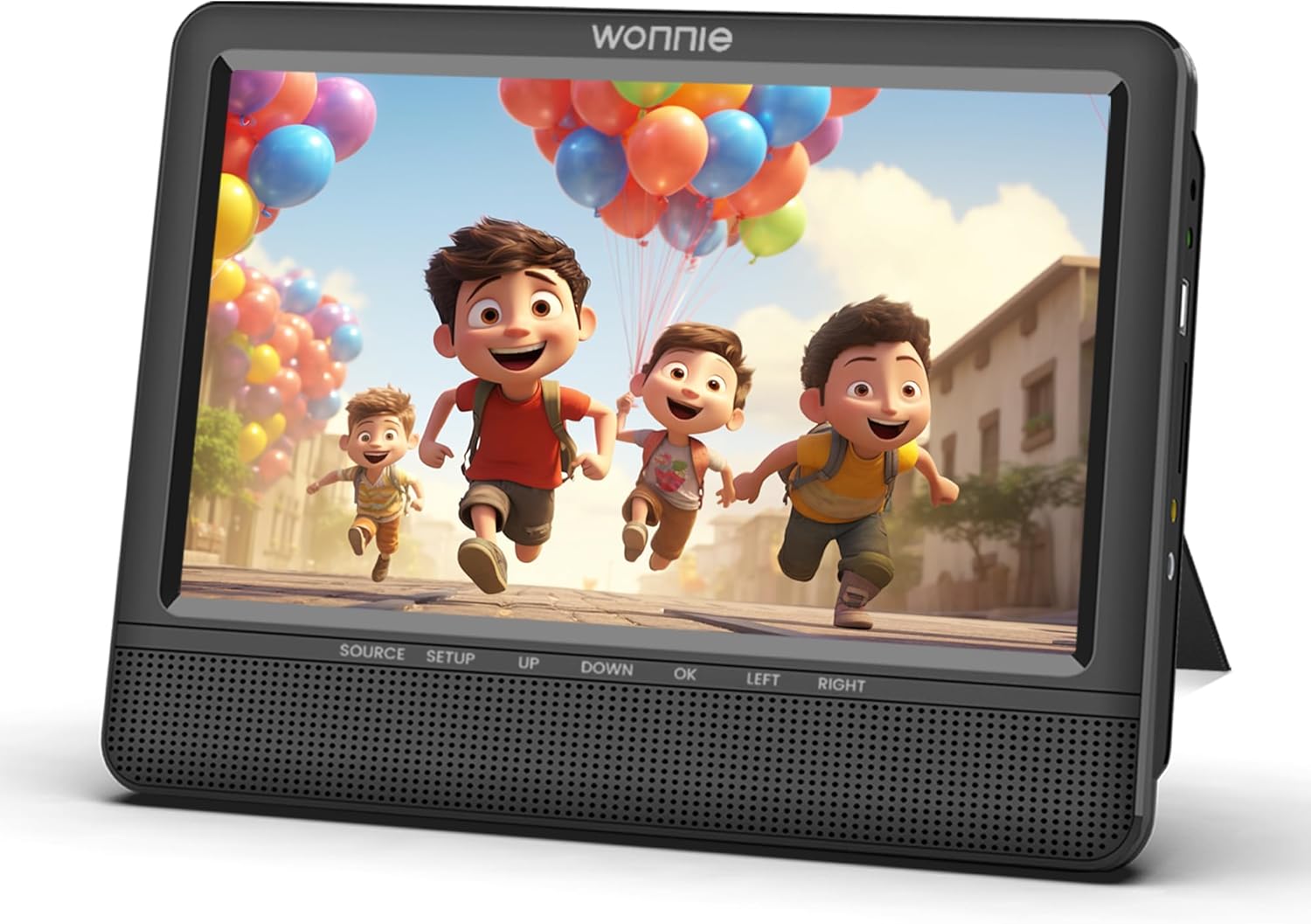Image: Front view of the WONNIE W-612D portable DVD player. The screen displays a colorful cartoon scene. Below the screen are control buttons labeled SOURCE, SETUP, UP, DOWN, OK, LEFT, and RIGHT, along with speaker grilles.