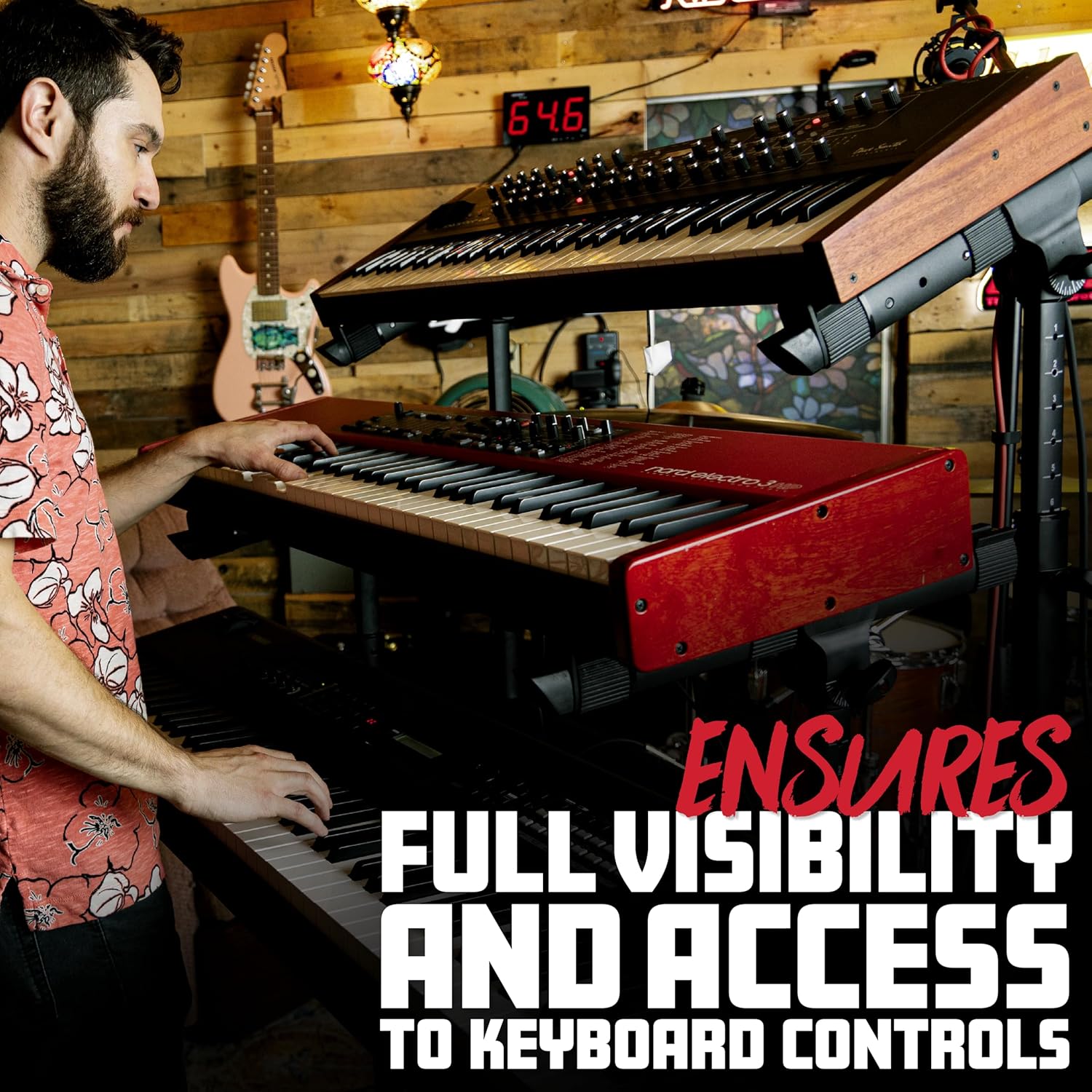 Image: A musician interacting with keyboards on the stand, illustrating how the adjustable design allows for full visibility and easy access to controls.