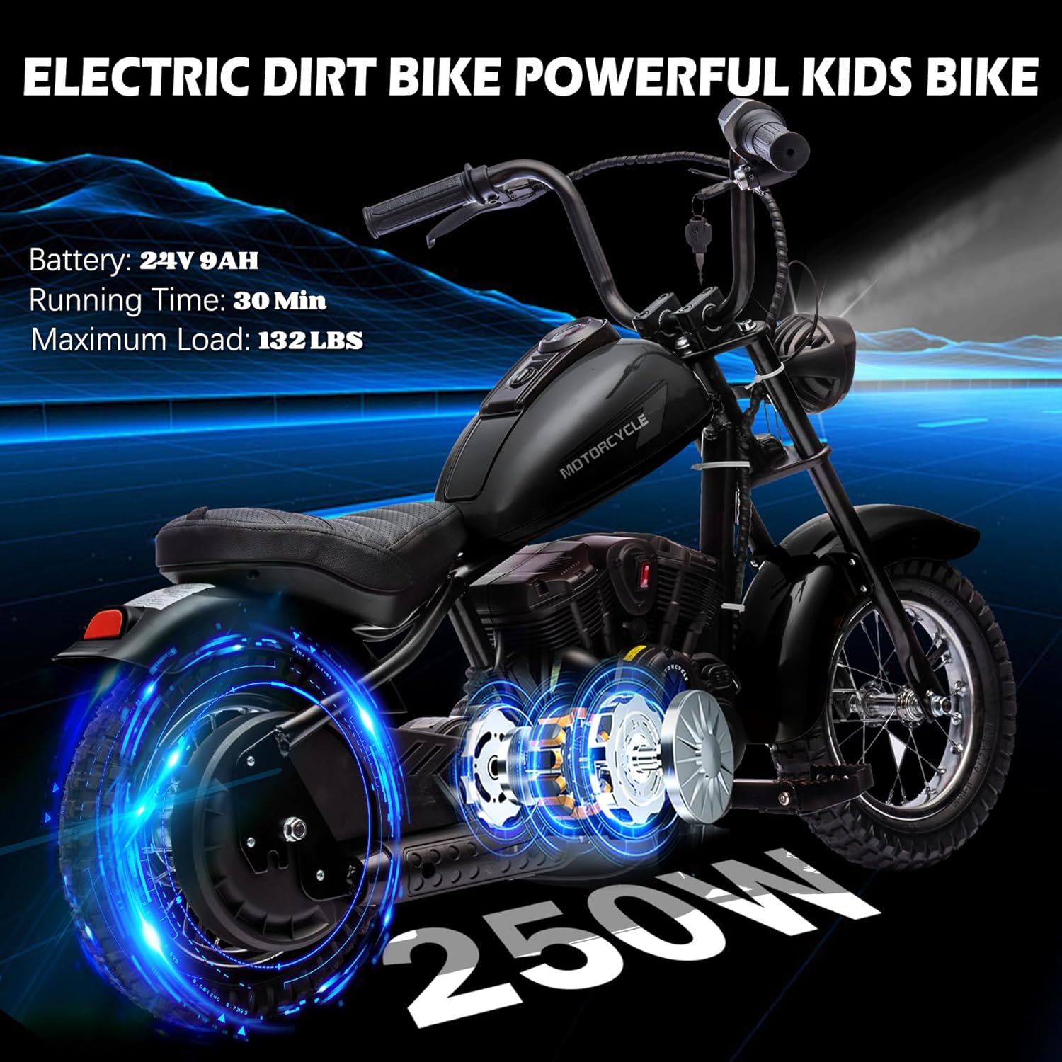 This user manual provides essential information for the safe operation, assembly, maintenance, and troubleshooting of your new JoyWheels Kids Electric Motorcycle. Please read this manual thoroughly before initial use and retain it for future reference. This electric motorcycle is designed to provide an exciting and safe riding experience for children, featuring a 250W motor and a 24V 9AH battery, capable of reaching speeds up to 14 MPH.