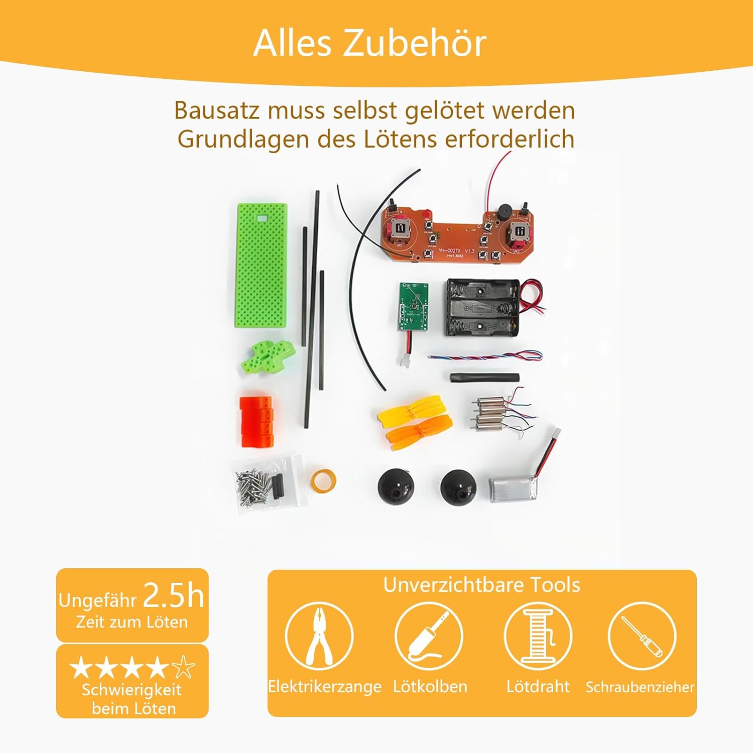 Image Description: This image displays all components included in the DIY drone kit, along with essential tools required for assembly: electrician's pliers, soldering iron, solder wire, and screwdriver. It indicates an approximate soldering time of 2.5 hours and highlights the high difficulty level for soldering.