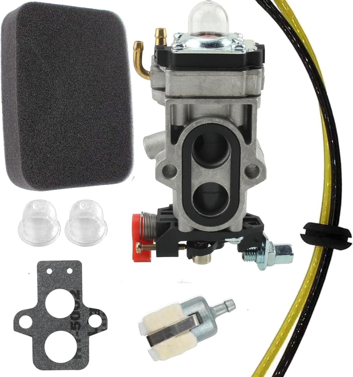 Figure 1: The BXparts TJ45E Carburetor shown with its accompanying gasket, fuel line kit, fuel filter, primer bulbs, and air filter. These components are essential for a complete replacement and proper engine function.