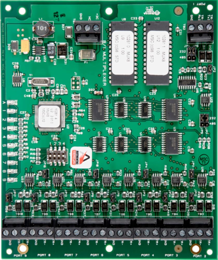 An overhead view of the green MERCURY SECURITY MUX8 8-Port Multi-Device Interface Panel. The board features multiple integrated circuits, connectors, and 8 labeled ports at the bottom for data line expansion.