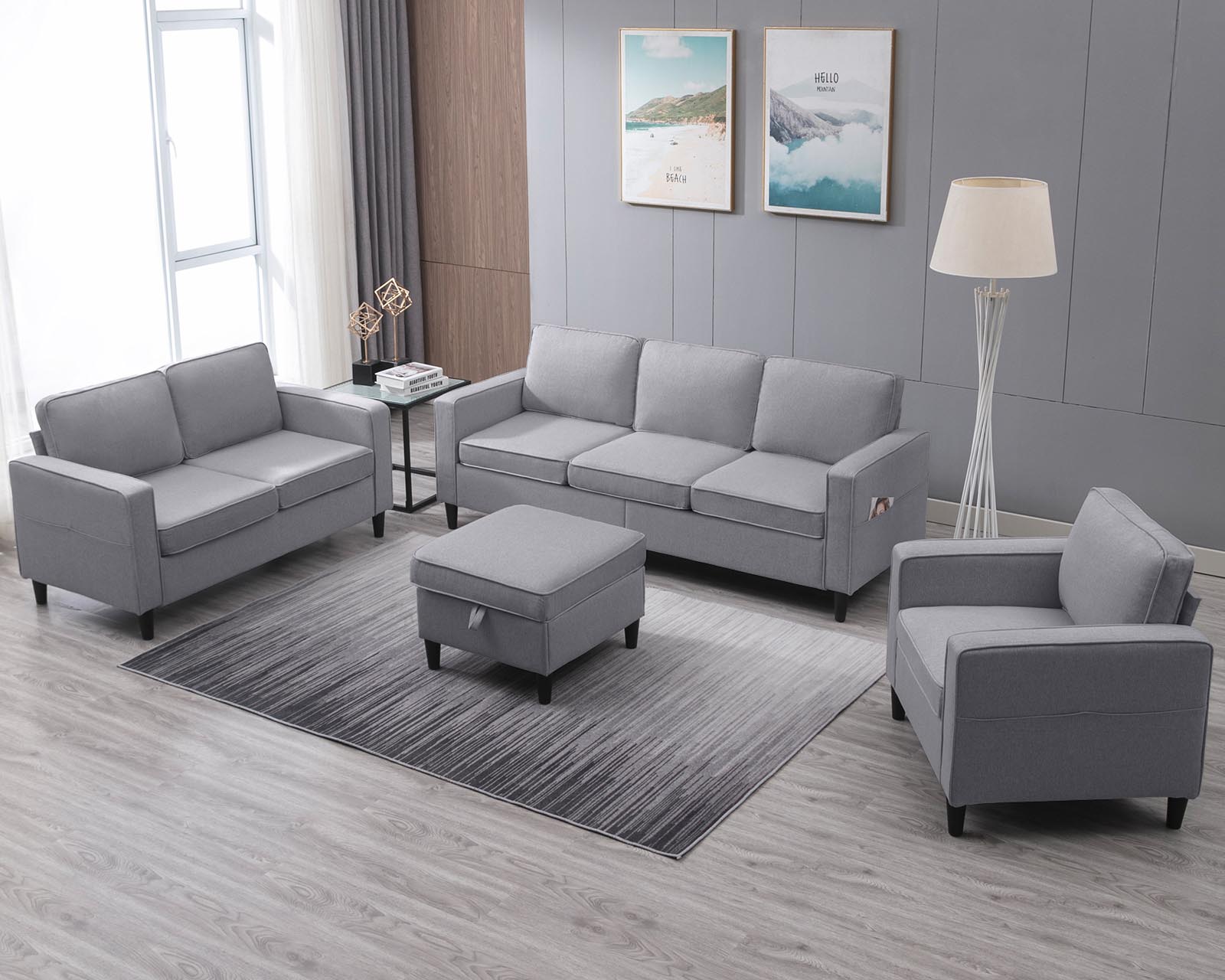 - Flexible Storage Ottoman: Includes a movable ottoman with built-in storage. This ottoman can be positioned with any seat to create an L-shaped sectional or used independently, providing additional seating or storage space.