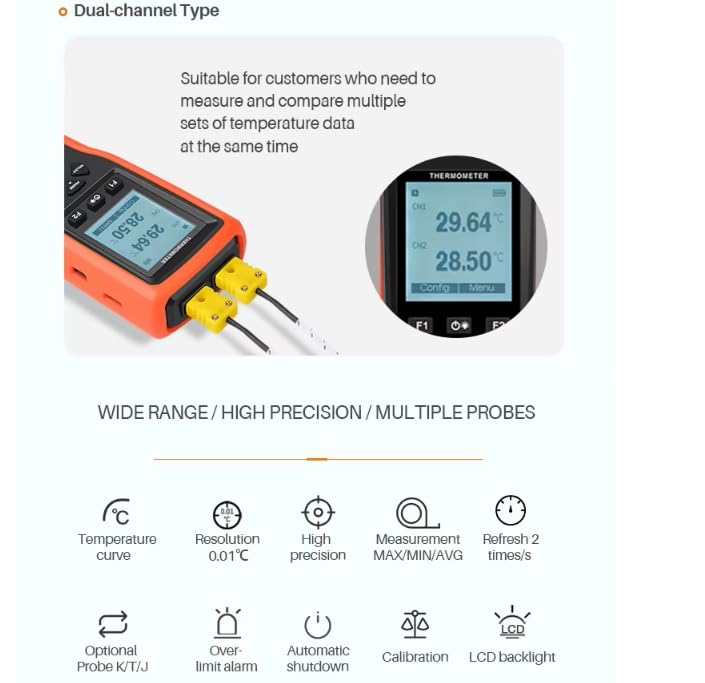 - Dual-Channel Measurement: Simultaneously measure and display temperatures from two independent thermocouple probes.