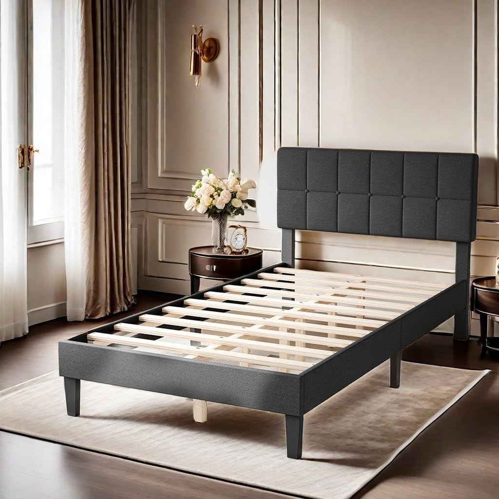 | Material | Metal frame, Wooden slats, Linen fabric upholstered headboard, Foam padding |