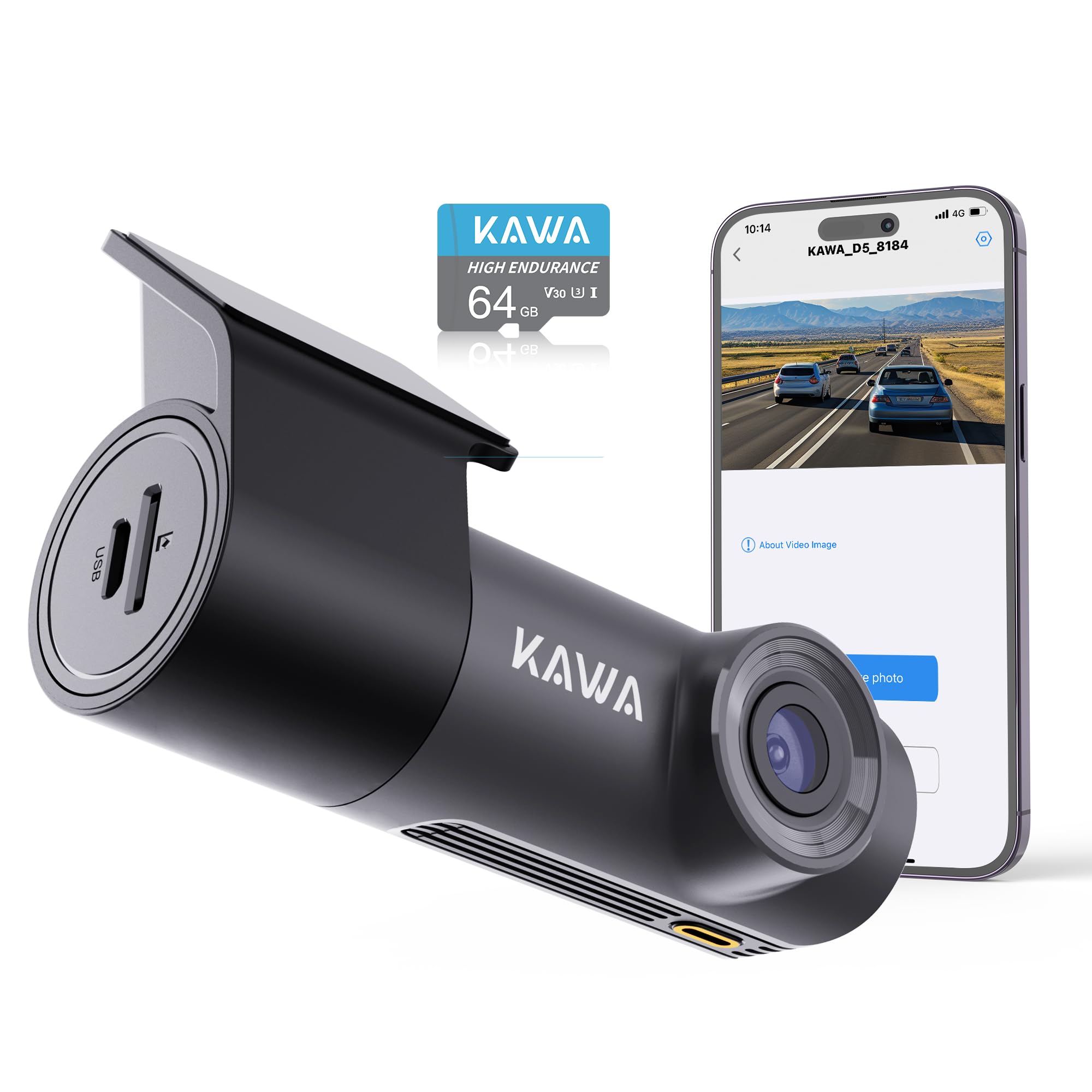 The KAWA Dash Cam D5 is a compact 2K 1296P QHD front dash camera designed to record your driving journey. It features hands-free voice control, built-in Wi-Fi for app connectivity, continuous loop recording, G-Sensor for emergency event detection, and enhanced night vision for clear footage in low-light conditions. The discreet design ensures it does not obstruct your view while driving.