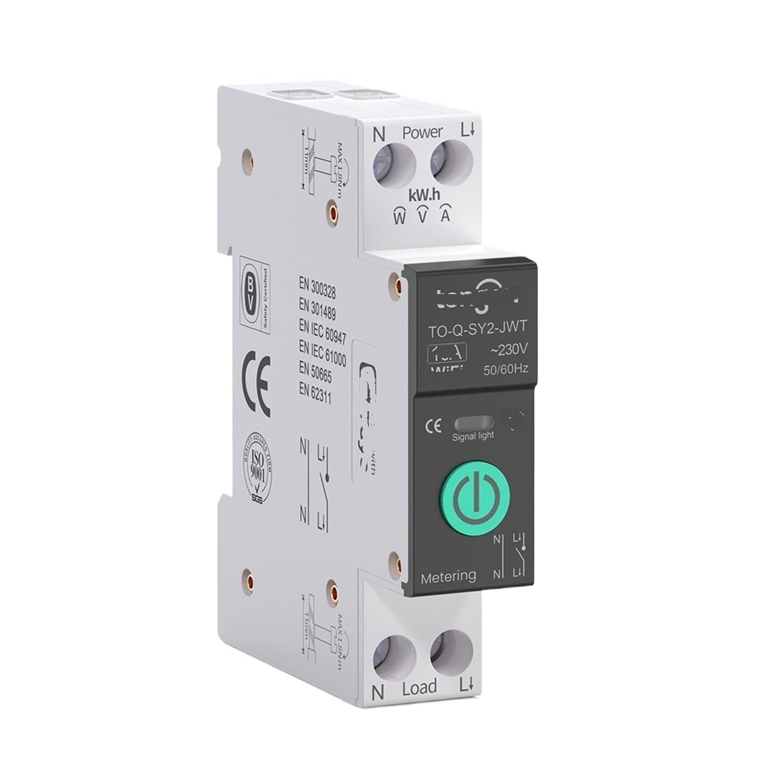The TO-Q-SY2-JWT is an intelligent circuit breaker designed for DIN rail mounting. It offers remote control capabilities via Wi-Fi and provides circuit protection. Some models include a power metering function.