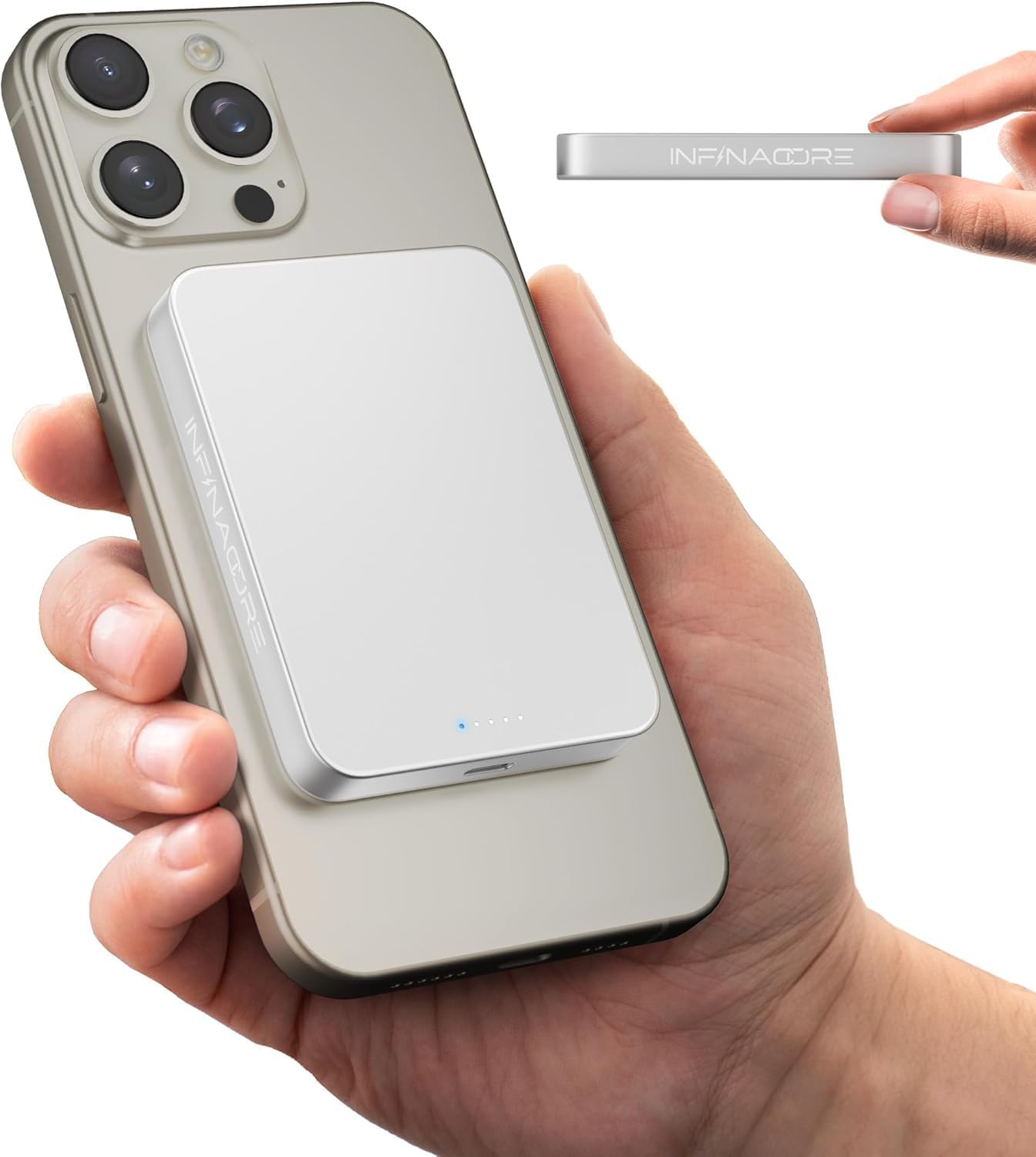 The InfinaCore MagSafe Battery Pack securely attaches to the back of a compatible iPhone, providing portable power.