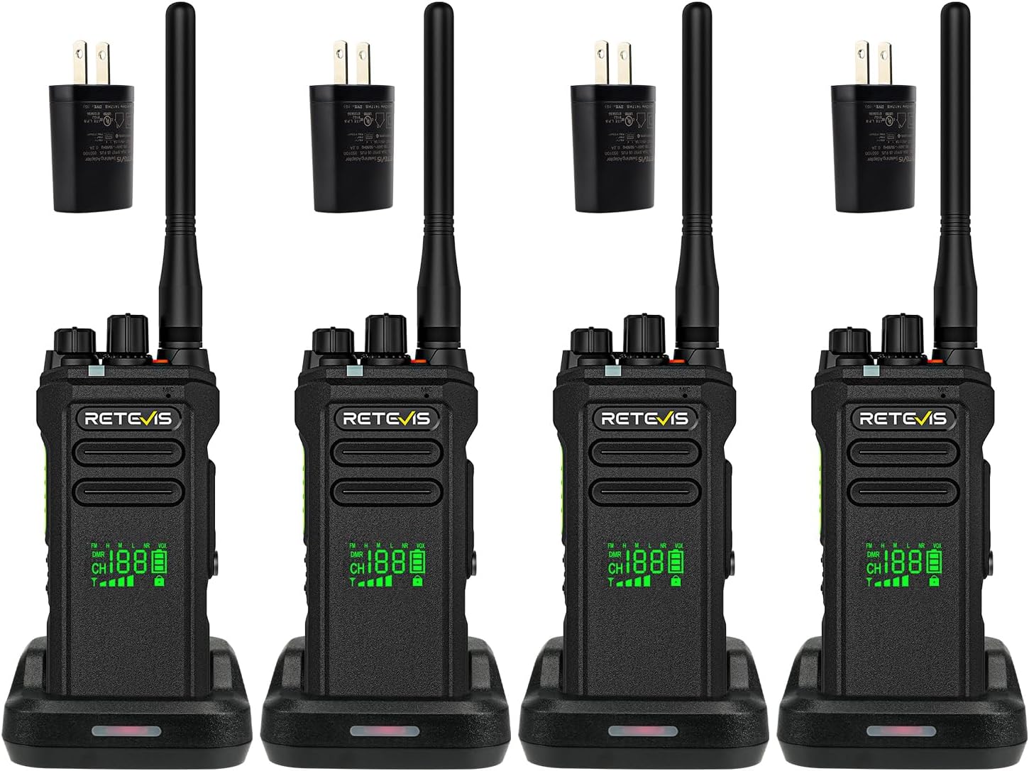 This image displays four Retevis NR30D two-way radios, each with its antenna, battery, and individual charging base. Power adapters are also visible, indicating a complete communication solution.