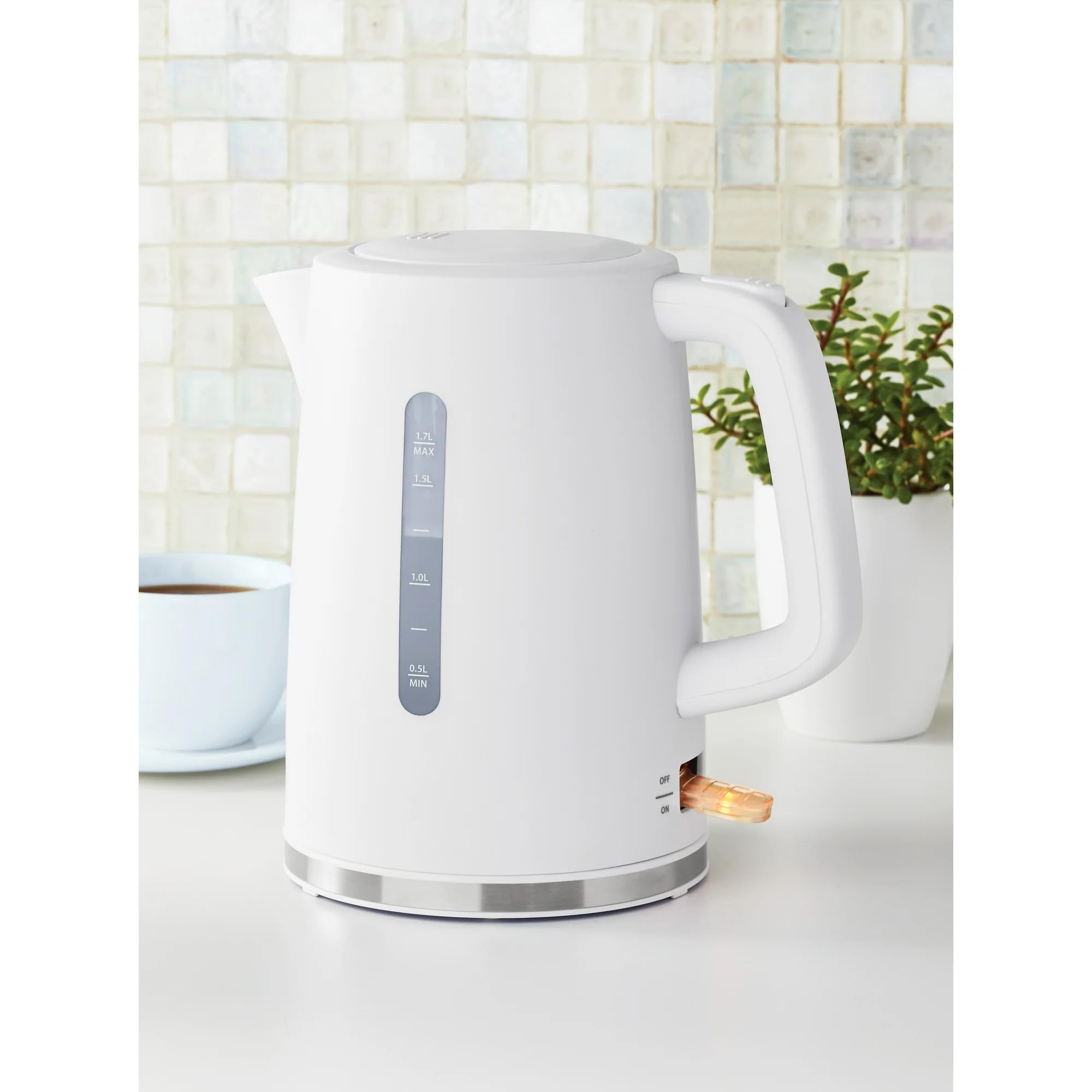 Image: Front view of the Mainstays 1.7L Electric Kettle, showing the water level indicator and handle.
