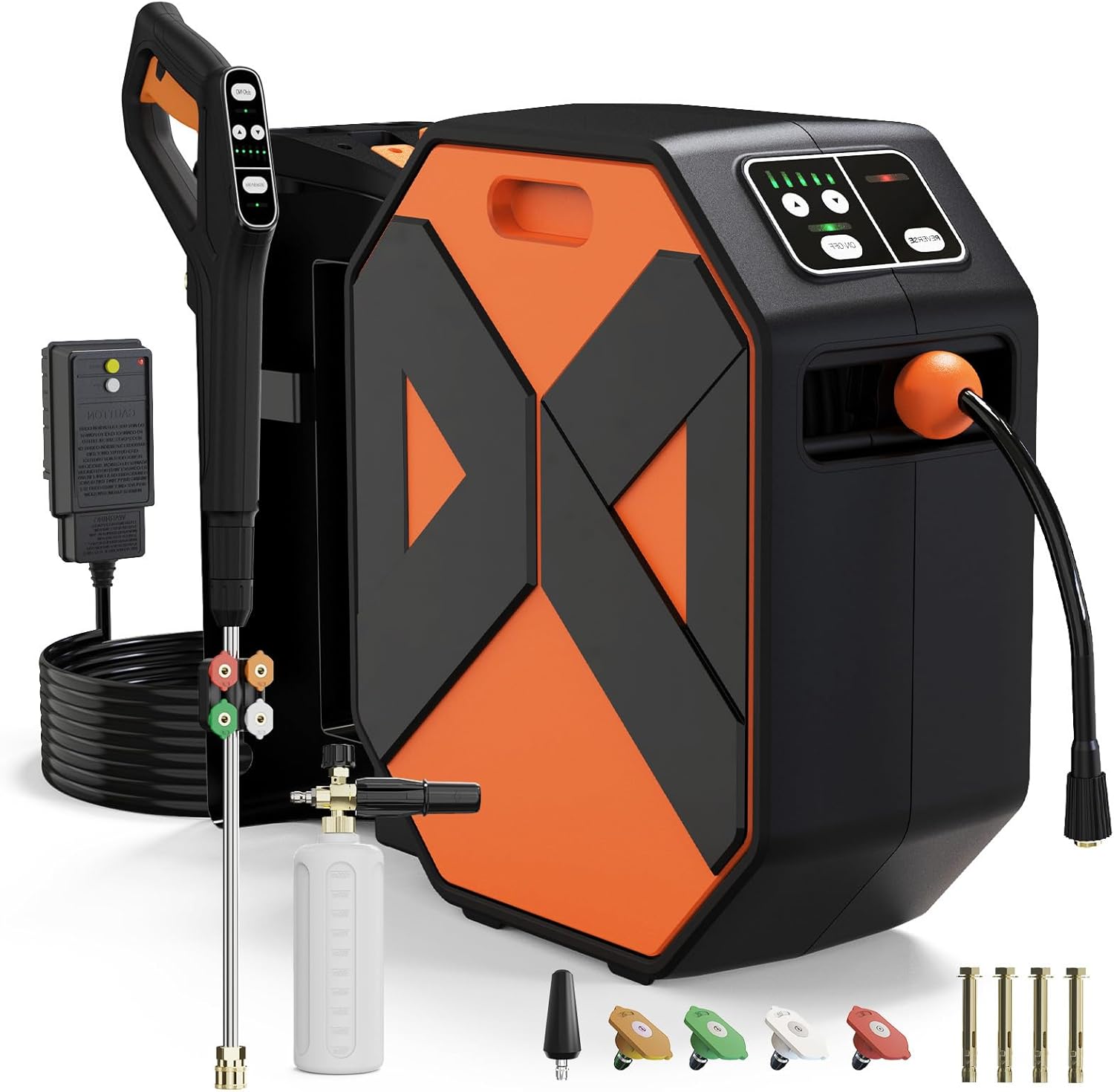 The Buyplus Wall Mounted Pressure Washer is designed for convenient and powerful cleaning tasks around your home, garage, and vehicles. Its wall-mounted design with a 100-foot retractable hose offers space-saving storage and extended reach, eliminating the need to move a bulky unit. The remote-controlled operation allows for easy pressure adjustment and hose retraction from a distance, enhancing flexibility and user comfort. Equipped with a GFCI power cord for safety, a foam cannon, and five interchangeable nozzles, this unit is versatile for various cleaning needs.