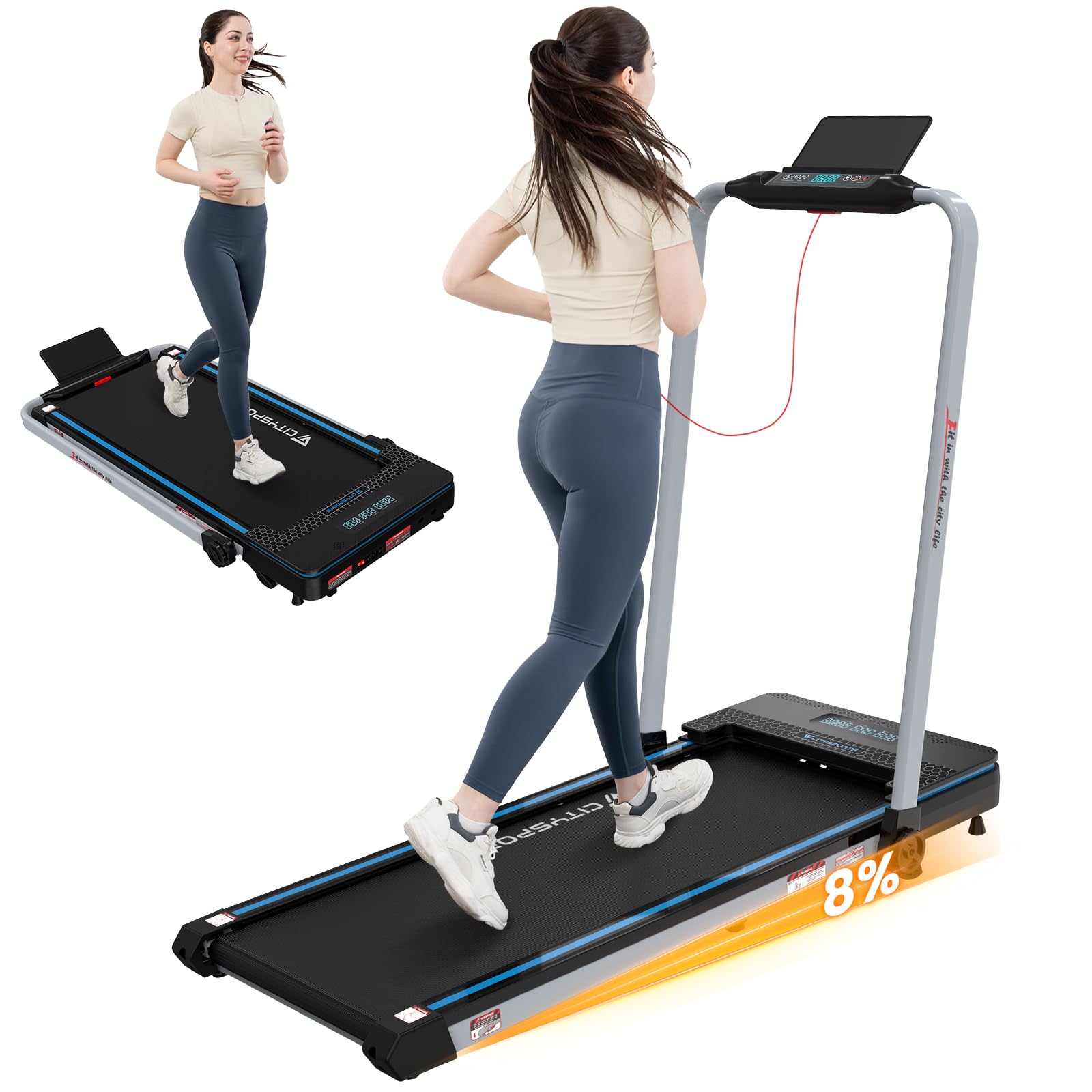 The 2-in-1 design allows for both walking pad and treadmill functionality. When the handle is folded down, it functions as a walking pad, ideal for use under a desk. When the handle is upright, it functions as a traditional treadmill for running or brisk walking.