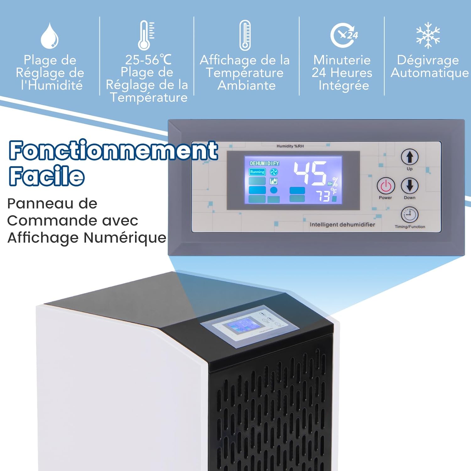 Figure 1: Control Panel and Features. This image displays the digital control panel, highlighting features such as humidity setting range, temperature setting range, ambient temperature display, 24-hour timer, and automatic defrost function.
