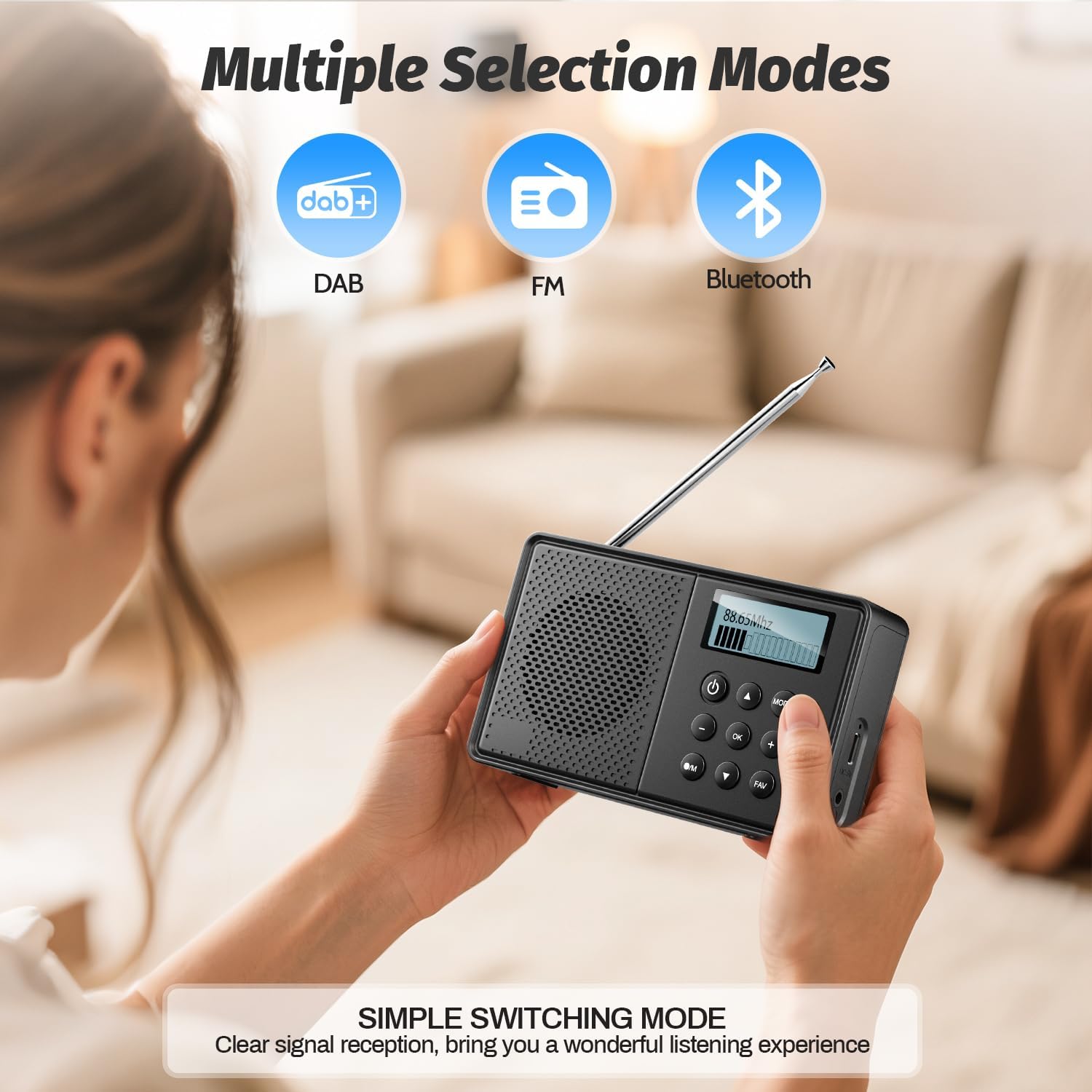- Mode Button: Switches between DAB, FM, and Bluetooth modes.