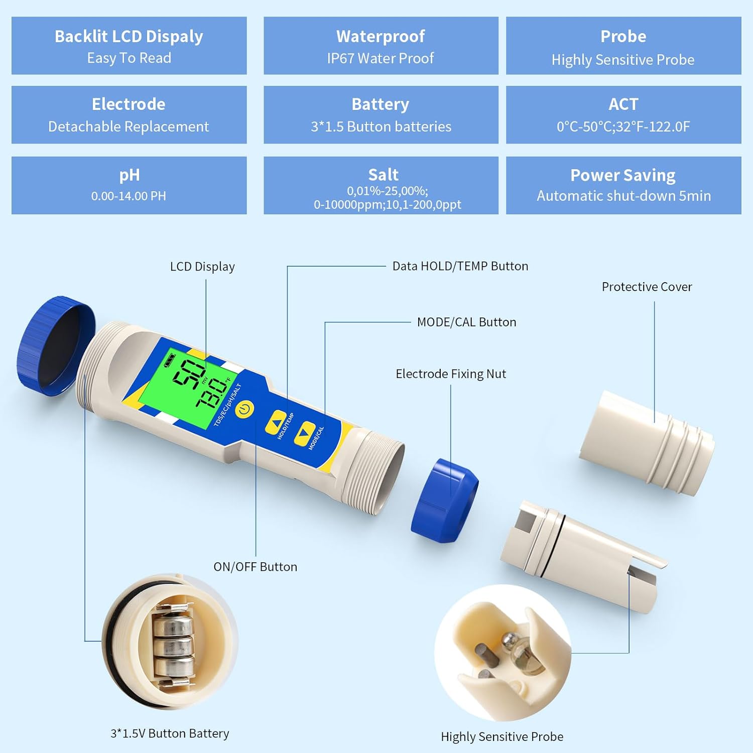 - Measurement Ranges: pH (0.00-14.00 pH), Salt (0.01%-25.00%; 0-10000ppm; 10.1-200.0ppt), Temperature (0°C-50°C / 32°F-122°F).