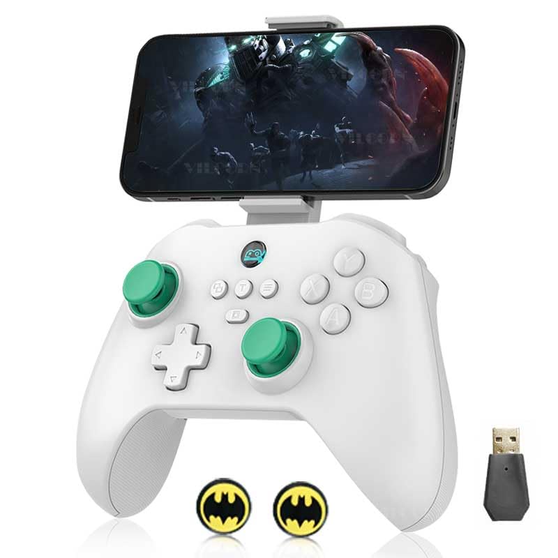 Image: The VILCORN Z03 Wireless Gaming Controller in white, with a smartphone attached to its integrated holder, demonstrating its use for mobile gaming. A USB dongle and two small circular accessories are also visible.