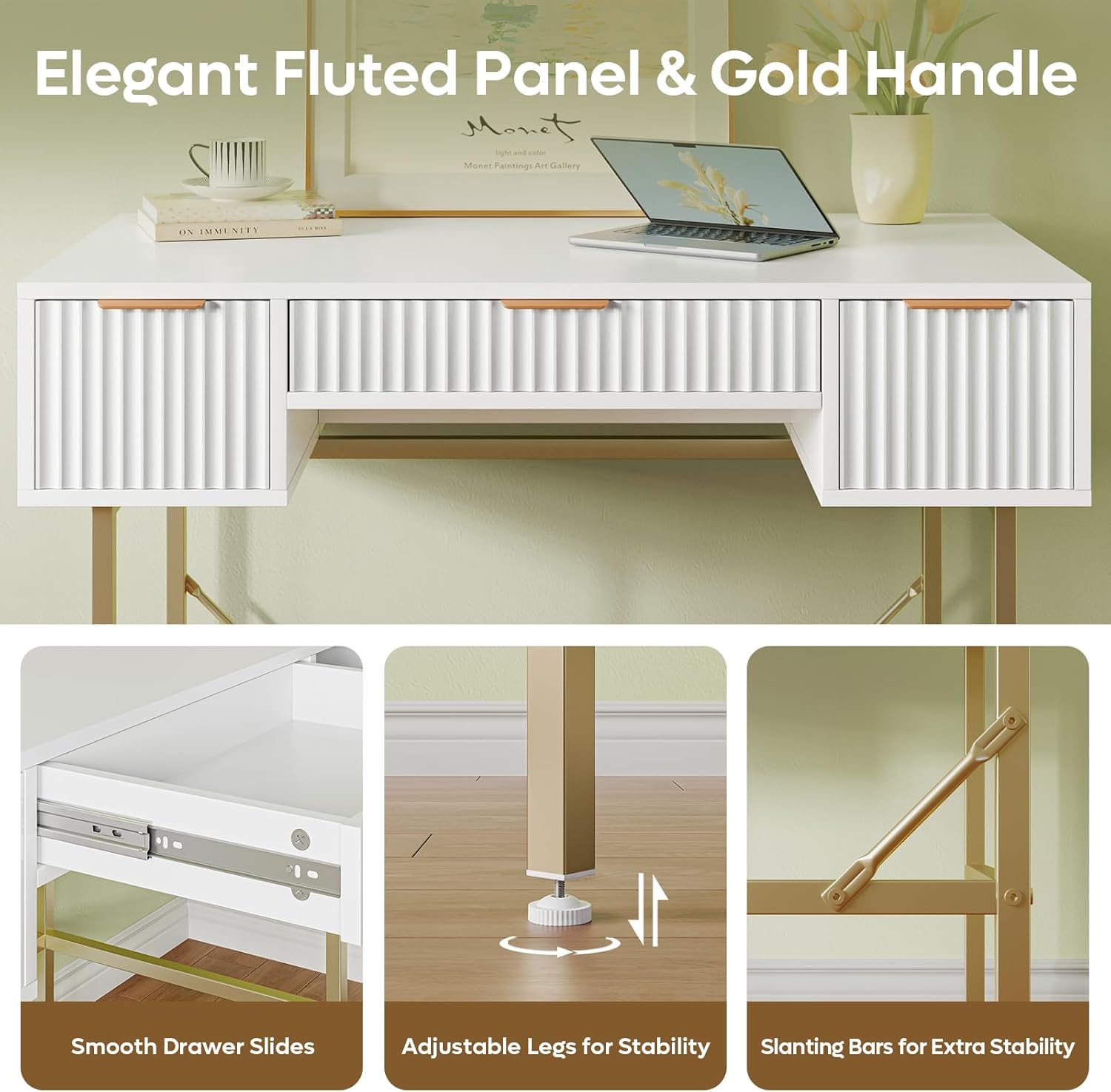 Thank you for choosing the Bestier 47.6 Inch Fluted Computer Writing Desk. This versatile piece of furniture, featuring chic fluted white drawer panels and elegant gold handles, is designed to enhance your home office, bedroom, or vanity area. Its robust construction and thoughtful design provide both functionality and style. This manual provides essential information for assembly, operation, maintenance, and troubleshooting to ensure a satisfactory experience with your new desk.