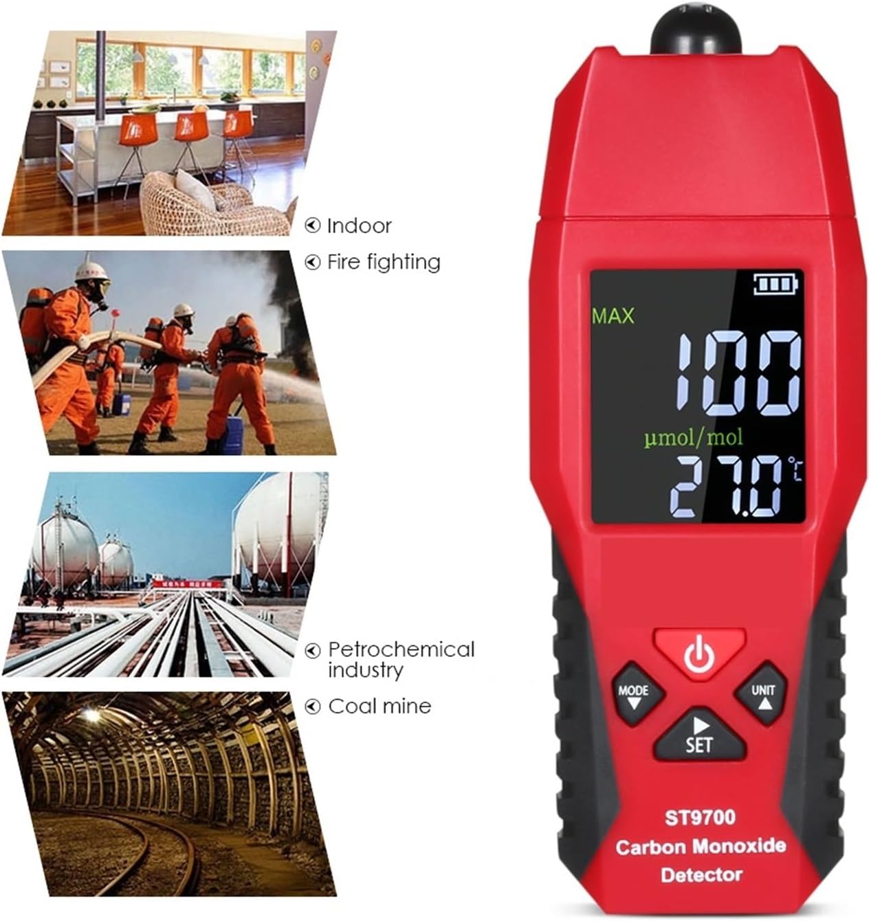 Figure 1: KYKYK ST9700 Carbon Monoxide Meter shown in various application environments, including residential, industrial, and emergency response settings.