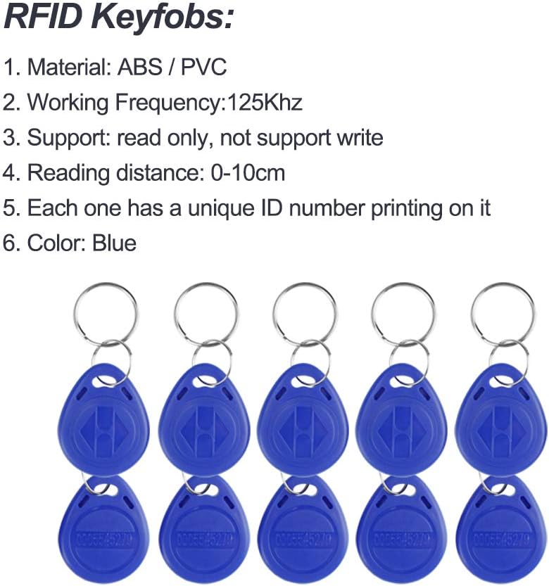 Image: A close-up view of the blue RFID keyfobs, detailing their material (ABS/PVC), working frequency (125KHz), read-only support, reading distance (0-10cm), unique ID printing, and color (Blue).
