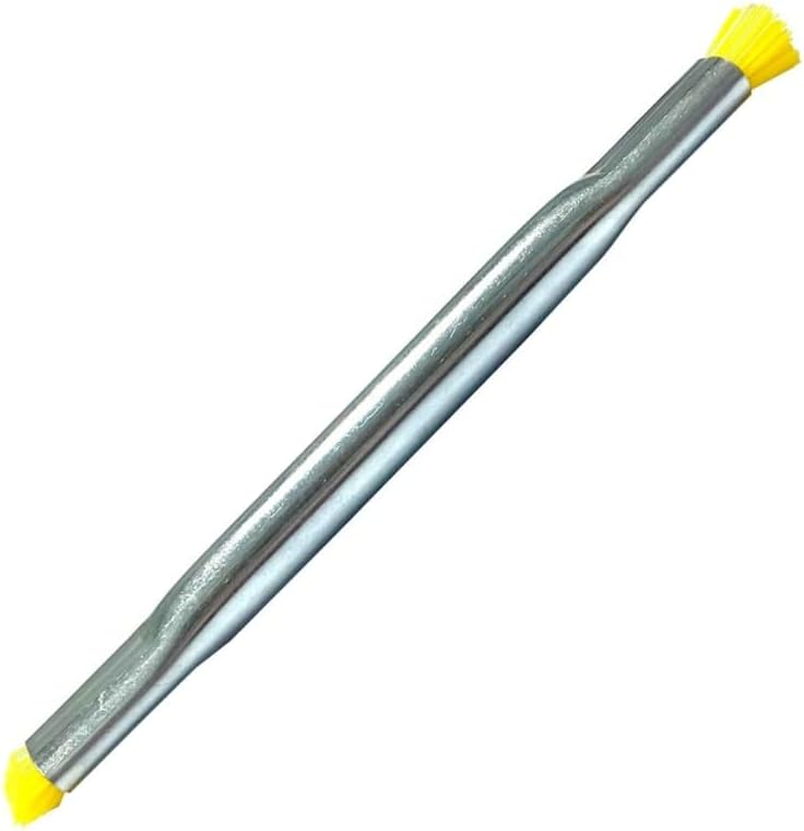 Image 1.1: The Techni-Pro 758CH0010 Double-Ended Applicator Brush. This image shows the brush with its metallic handle and yellow bristles at both ends. One end has a flat trim, and the other has a chiseled trim.