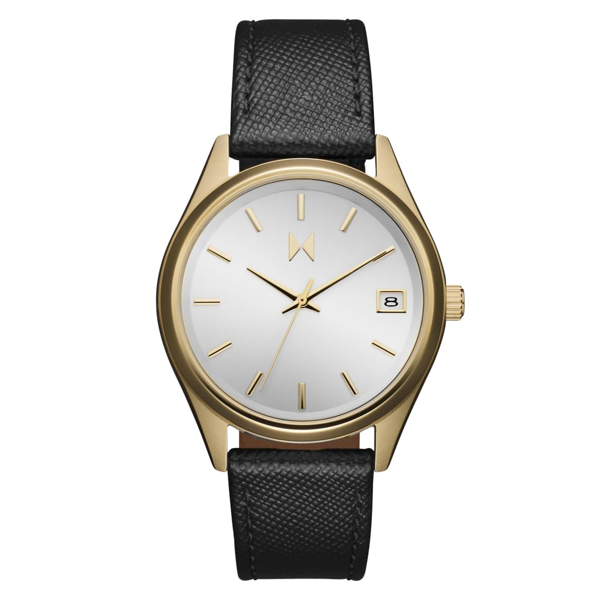 Image: Front view of the MVMT Rise Boyfriend watch, featuring a gold-toned case, white dial with gold hour markers, and a black textured calfskin strap.