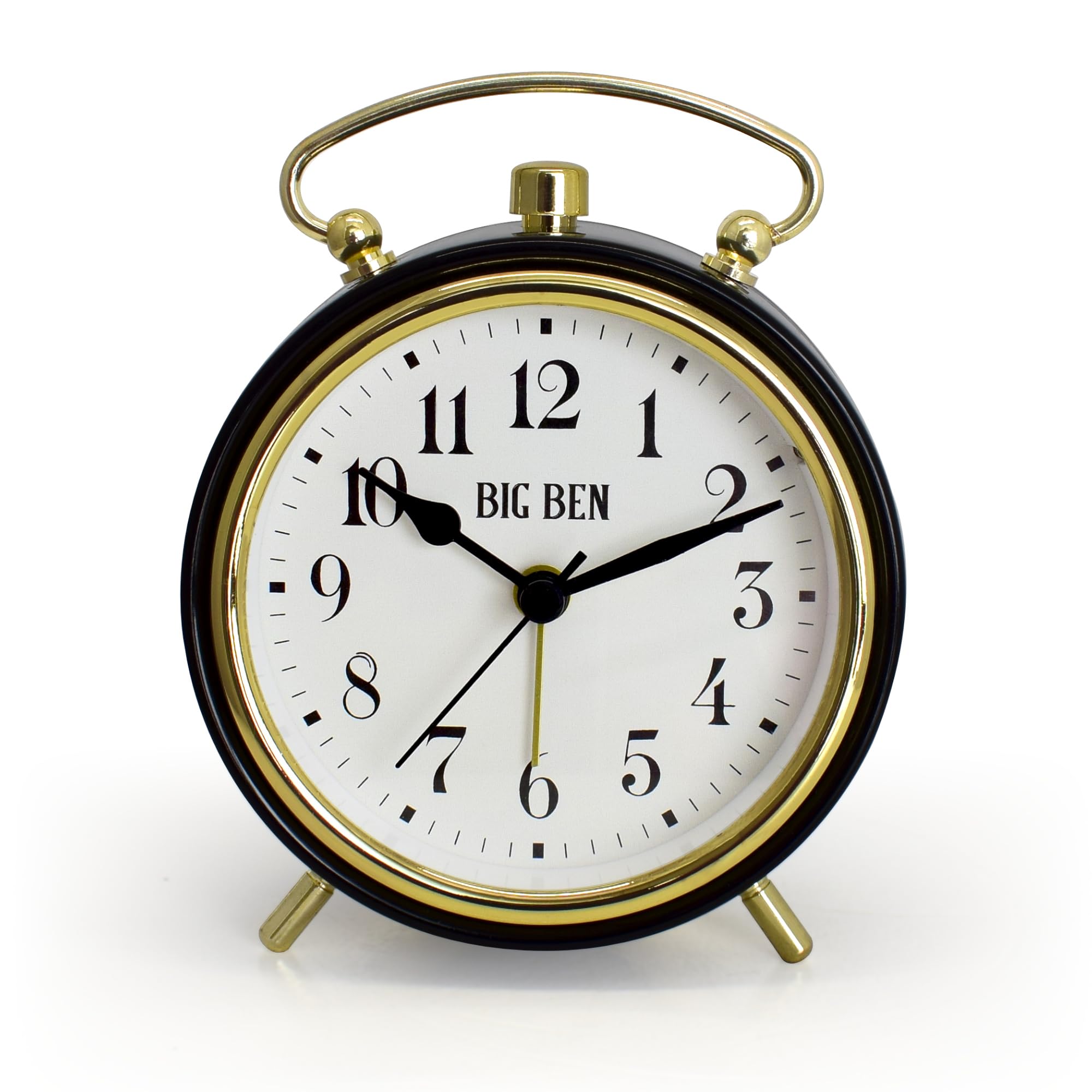 Figure 2.1: Front view of the Westclox Big Ben Classic Alarm Clock, showcasing its black metal case, gold trim, and easy-to-read white dial with bold black numerals. The clock face displays 10:10.