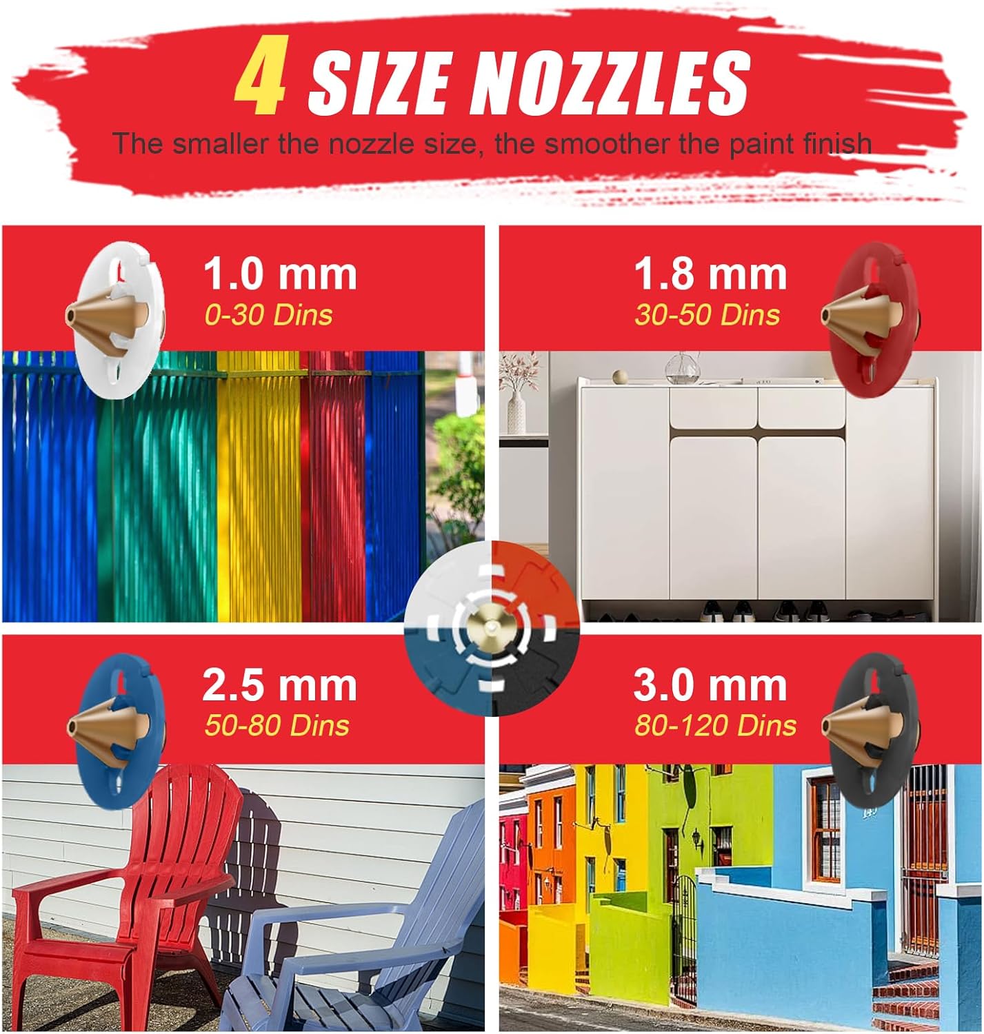 The sprayer comes with four different nozzle sizes (1.2mm, 1.5mm, 2.5mm, 3.0mm) to accommodate various painting projects and paint viscosities. Smaller nozzles are ideal for fine finishes and thinner materials, while larger nozzles are suitable for thicker paints and larger areas.