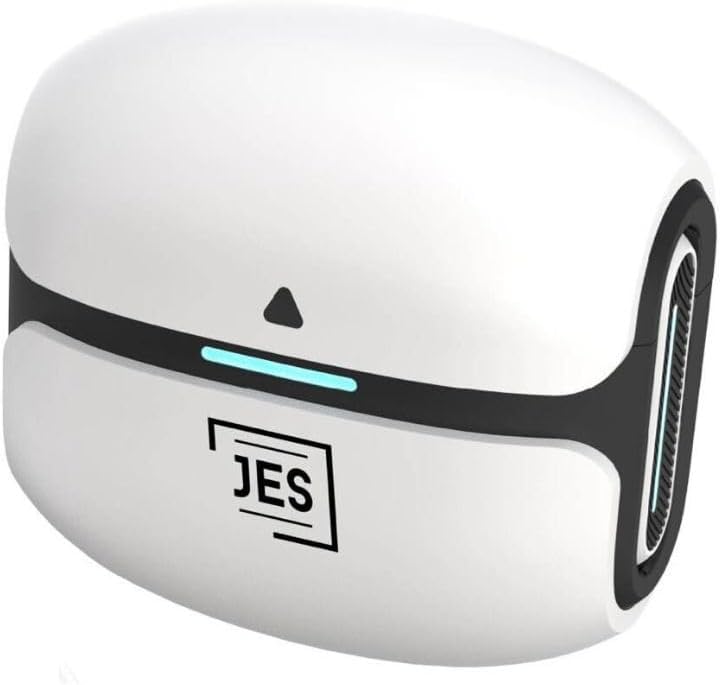 Image: The Genérico JESBT In-Ear Wireless Bluetooth Headphones charging case. The compact white case features a black band and a blue LED indicator, with the 'JES' logo prominently displayed.