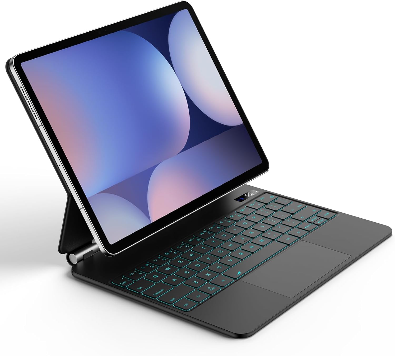 Image 1.1: The Bettdow Magnetic Keyboard Case with a tablet attached, showcasing its floating design and illuminated QWERTZ keyboard.