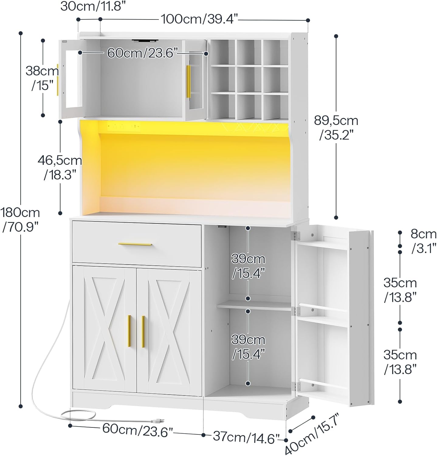- Glass Display Case: Located at the top, suitable for displaying dishware or decorative items.