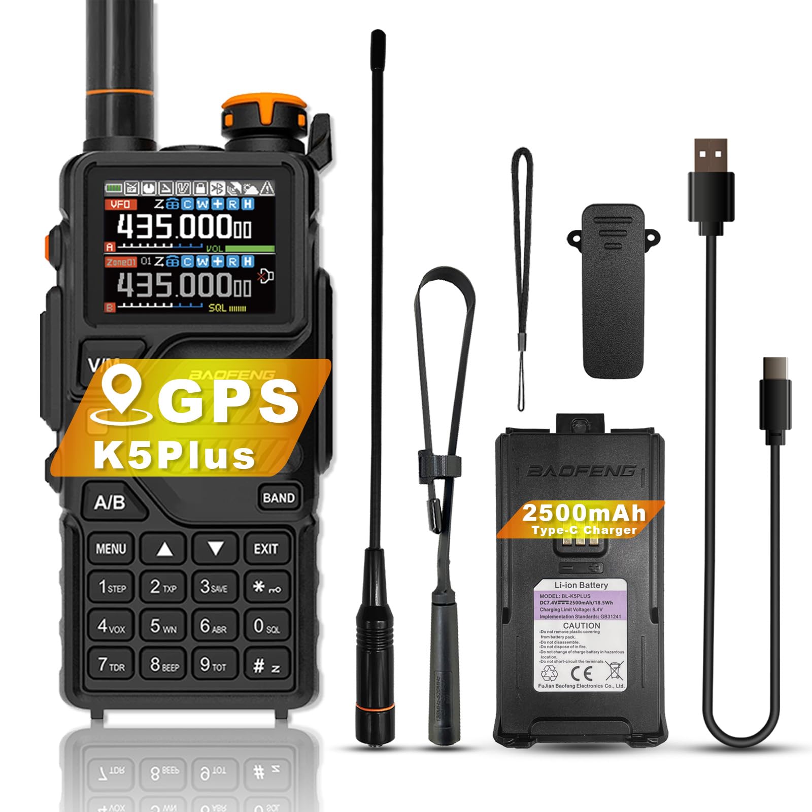 The BAOFENG K5Plus is a versatile two-way radio featuring a 1.77-inch TFT large screen, full keyboard, and fully open menu operation. It includes a built-in input method for editing channel names and supports various advanced functions such as GPS, DTMF, NOAA weather reception, and multiple scanning modes.