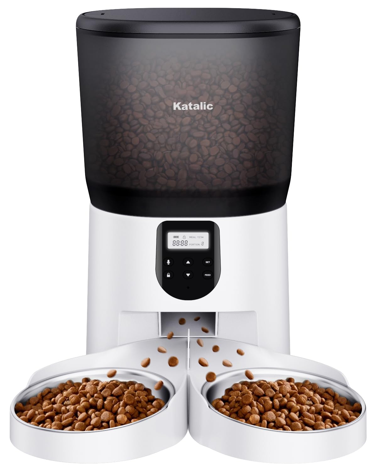 Image: Katalic PF004 Automatic Cat Feeder. This image shows the complete feeder unit, including the transparent food hopper, the control panel, and the dual stainless steel food bowls.