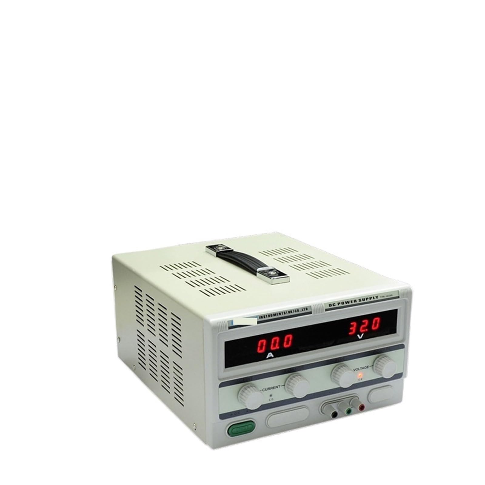 Figure 1: Front Panel of the TPR-3020D DC Power Supply. This image shows the main display, voltage and current adjustment knobs, output terminals, and power switch.